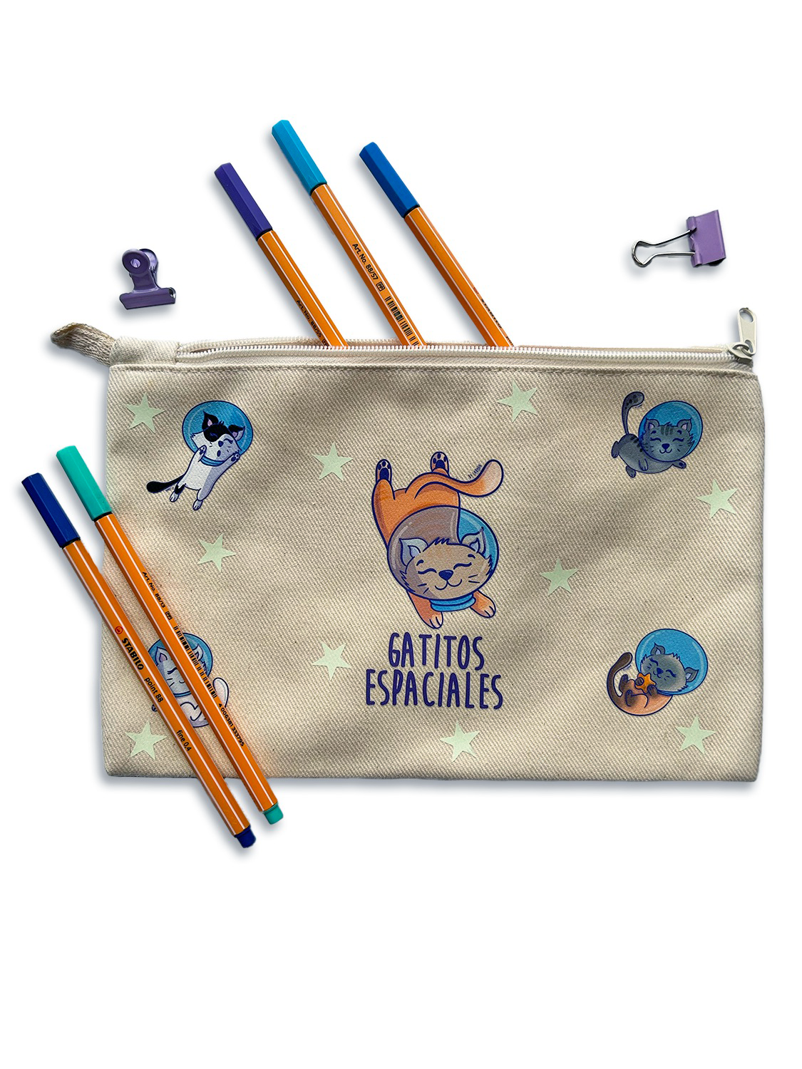 ESTUCHERA de Adorables Gatitos espaciales. Tela de mezclilla con estampado y detalles que brillan en la oscuridad, forro por dentro