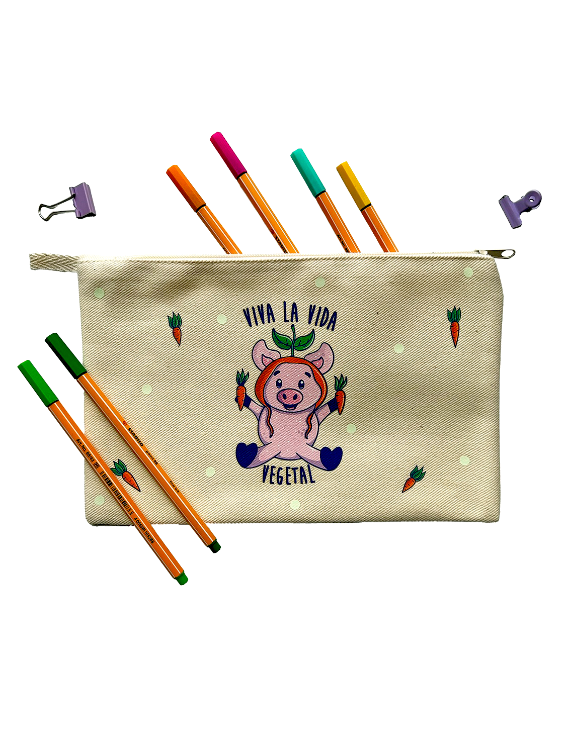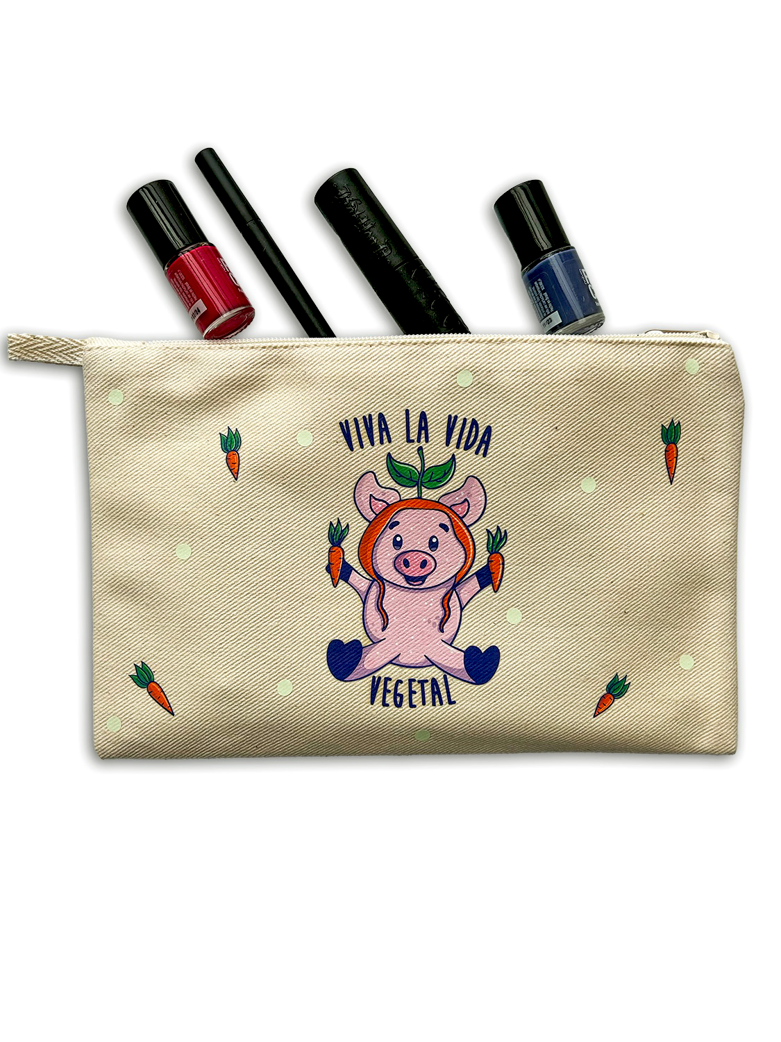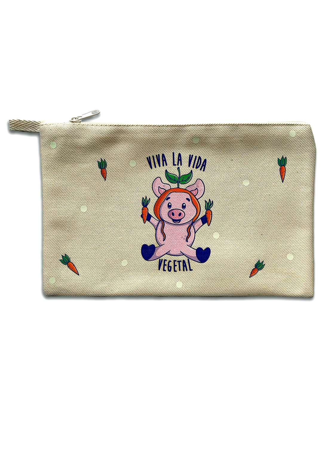 ESTUCHERA de Cerdito disfrutando de una vida vegetal, amando y respetando a los animales, go vegan. Tela de mezclilla con estampado y detalles que brillan en la oscuridad, forro por dentro.