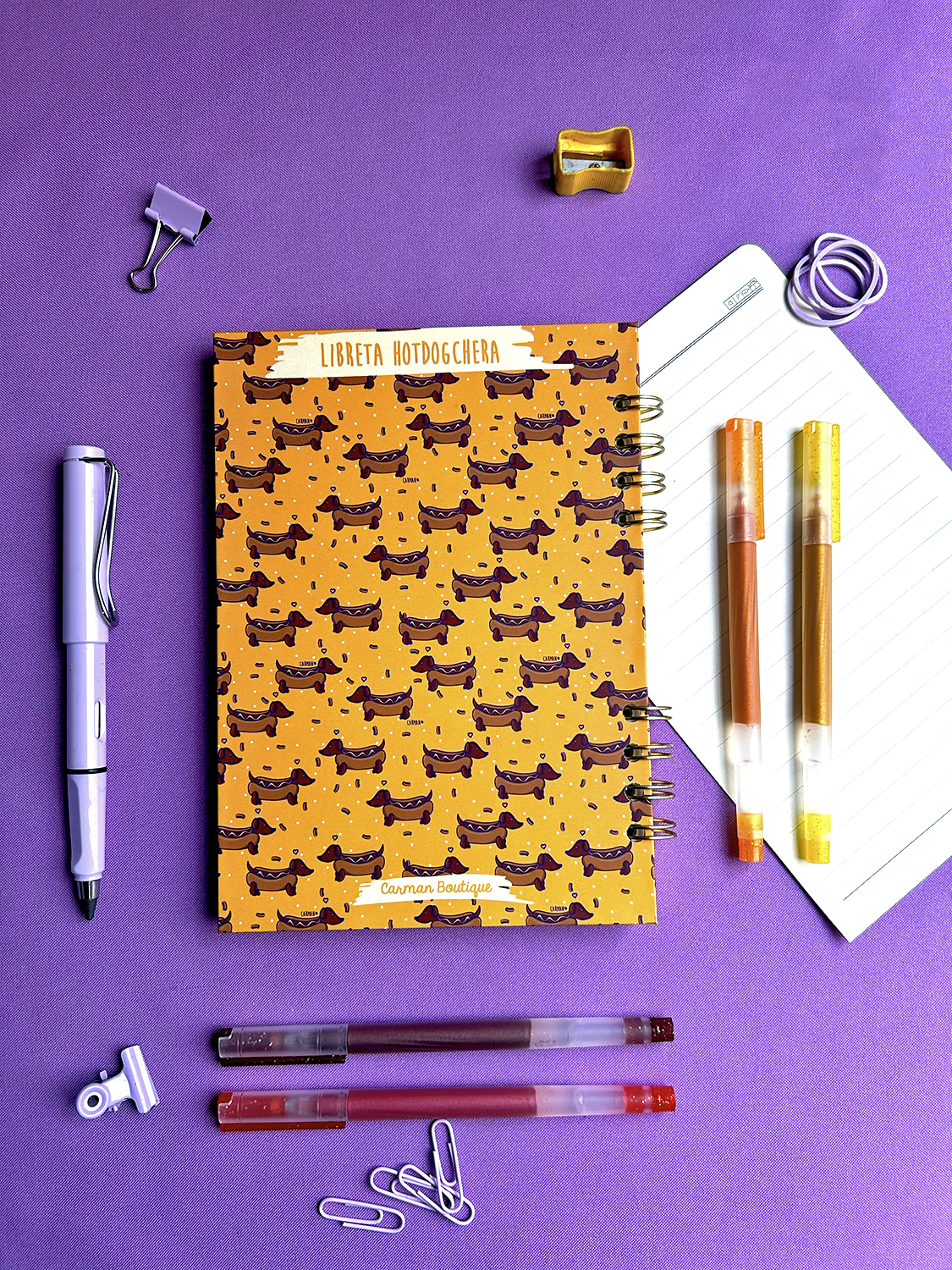Libreta de pasta dura con ilustración de Perrito salchicha hecho un Hotdog, hojas de 90 gr ahuesado, WIRE-o metálico.