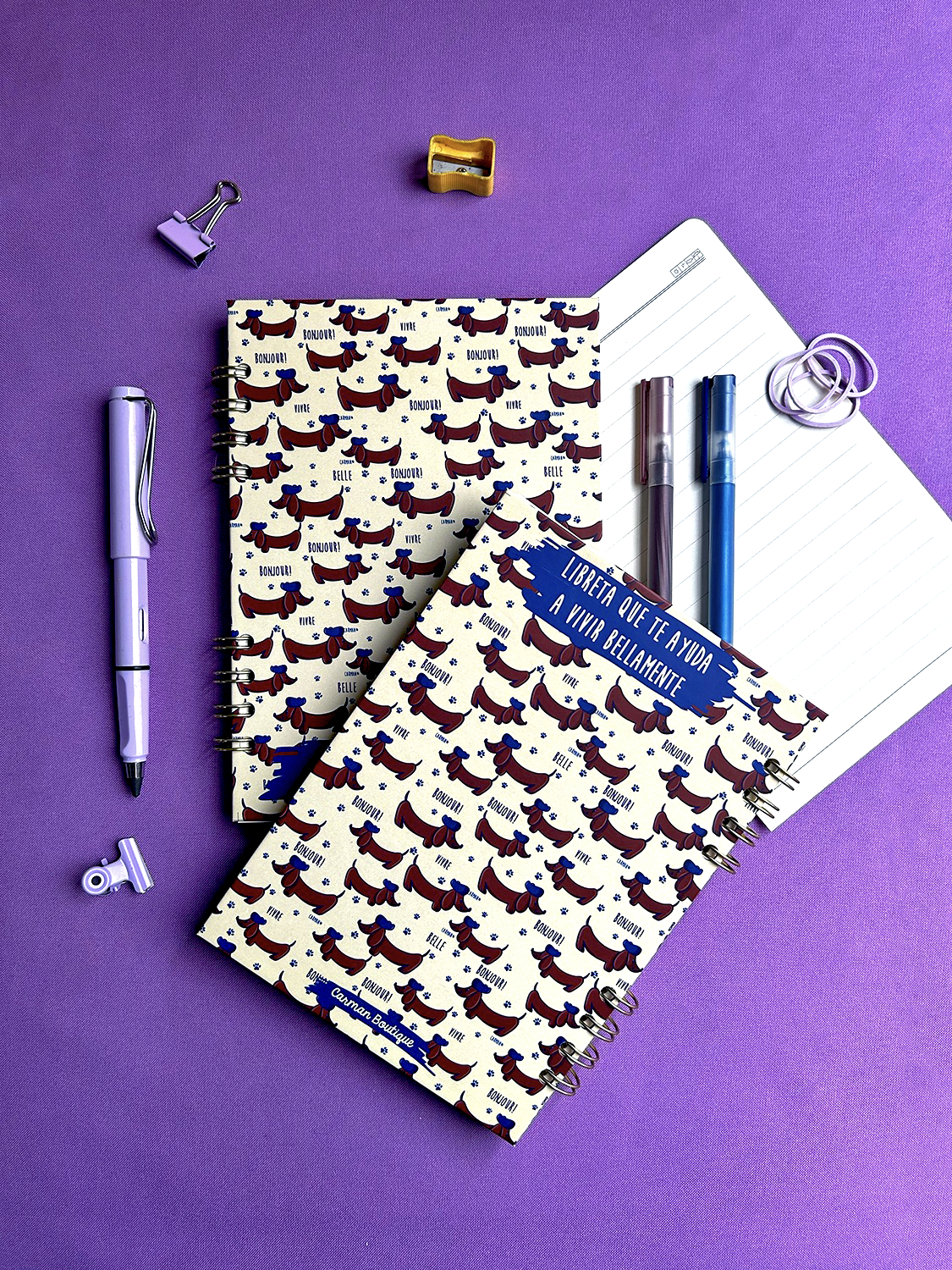 Libreta de pasta dura con ilustración de Elegante Salchicha francés, porque la vida es bella Bonjour!, hojas de 90 gr ahuesado, WIRE-o metálico.