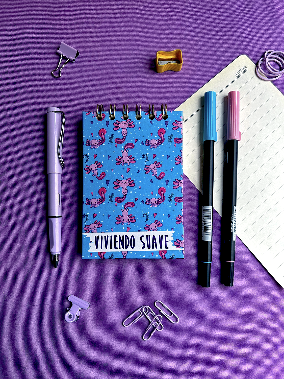 Libreta de pasta dura con ilustración de AJOLOTITOS relajantes y felices, hojas de 90 gr ahuesado, WIRE-o metálico.