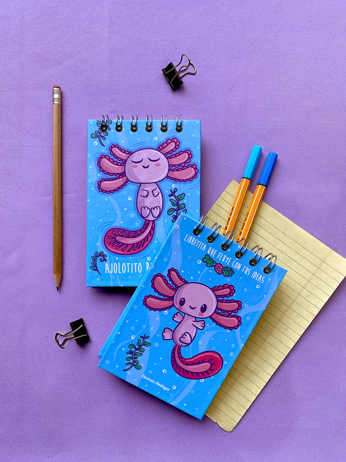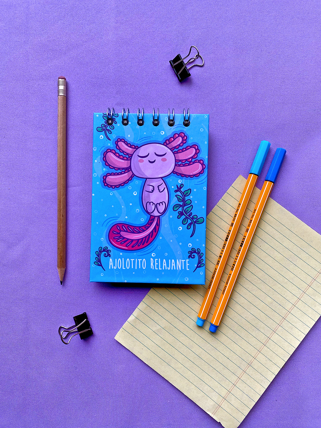 Libreta de pasta dura con ilustración de un bonito AJOLOTITO relajante, hojas de 90 gr ahuesado, WIRE-o metálico.
