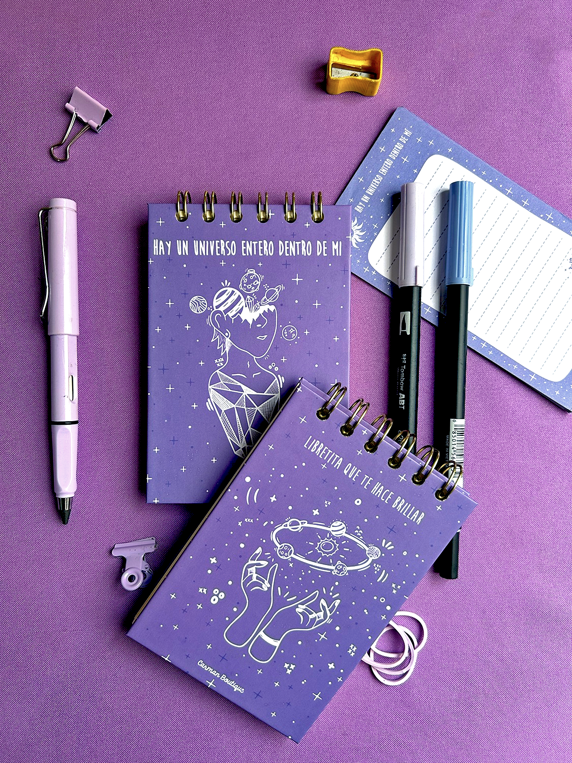 Libreta de pasta dura con ilustración de “Hay un universo entero dentro de mí”, hojas de 90 gr ahuesado, WIRE-o metálico.