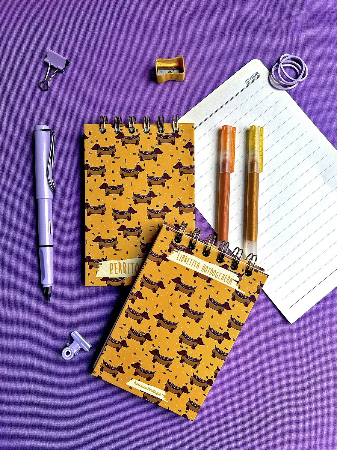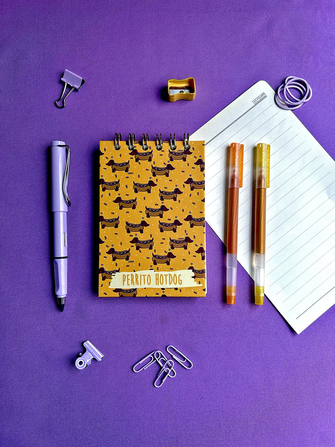 Libreta de pasta dura con ilustración de Perrito salchicha hecho un Hotdog, hojas de 90 gr ahuesado, WIRE-o metálico.