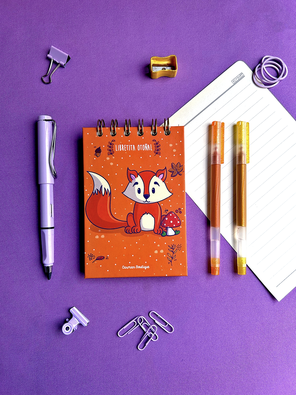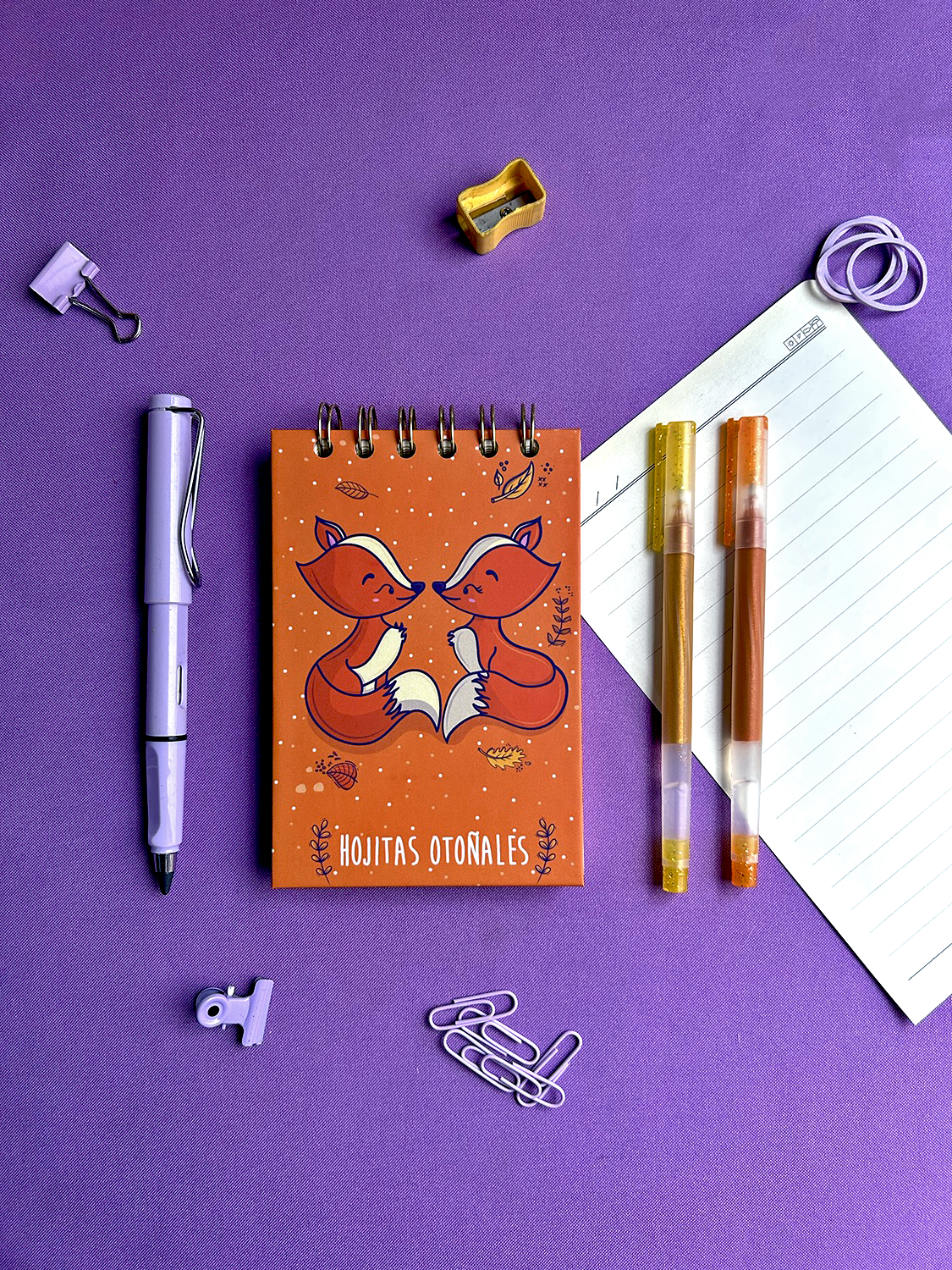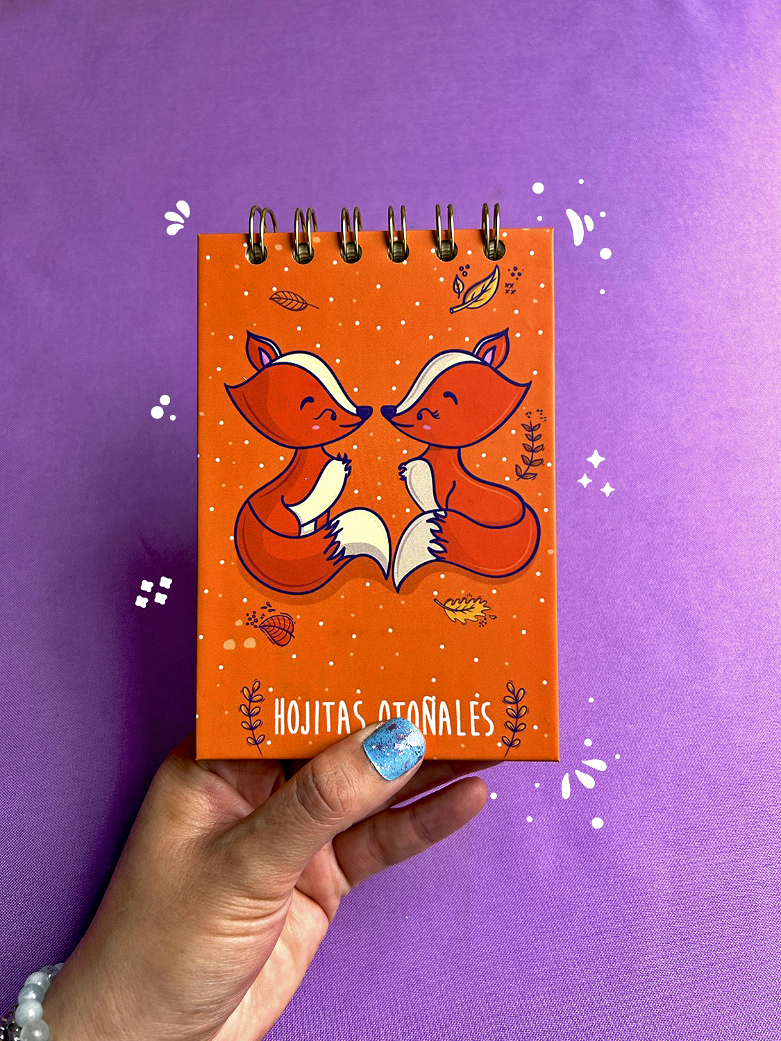 Libreta de pasta dura con ilustración de Zorritos que aman las hojitas otoñales, hojas de 90 gr ahuesado, WIRE-o metálico.